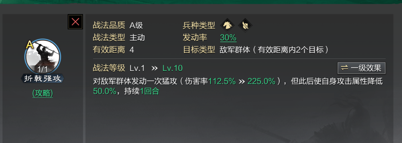 甘宁在战斗中主打前三回合爆发,折戟强攻是最适合他的战法之一。这个战法瞬发且伤害高,配合甘宁自带的侵略如火能显著提升发动率,前几回合触发概率更高。建议把折戟强攻放在第二个战法格,避免被其他主动战法占用发动机会。甘宁的攻击距离只有2,通常放在中军位置最合适,这样既能保证输出覆盖敌方中军和大营,也能避免被集火。