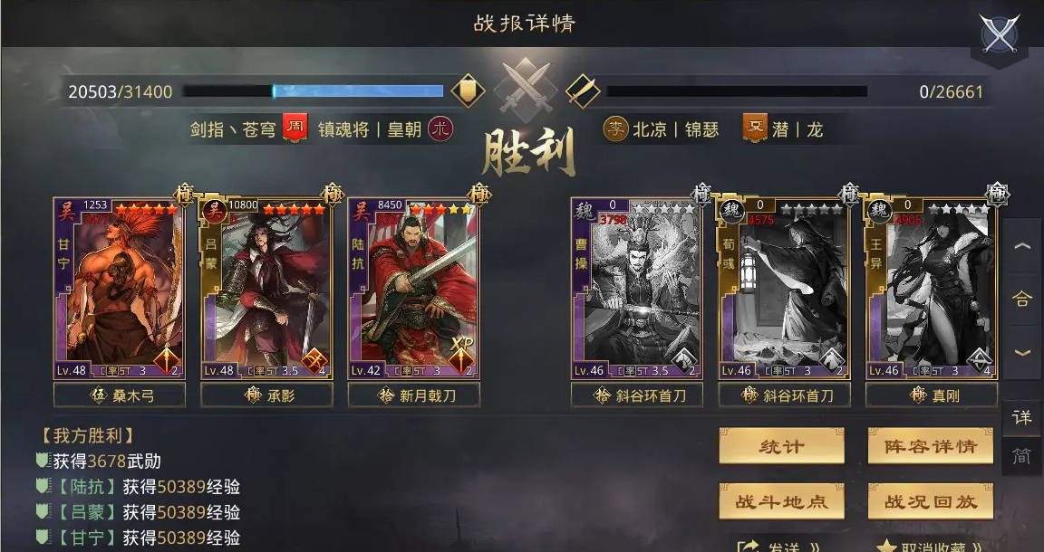 队伍搭配上,甘宁适合与孙权、吕蒙组队。孙权提供控制和先手,吕蒙补充伤害和封禁效果。神兵天降和大赏三军是核心增益战法,能进一步提升甘宁的爆发能力。如果没有吕蒙,可以用曹操替代,他的增伤效果同样能强化甘宁的输出。甘宁折戟强攻的爆发非常依赖前三回合,所以队伍最好搭配一些先手或增伤效果,确保开局就能压制对手。