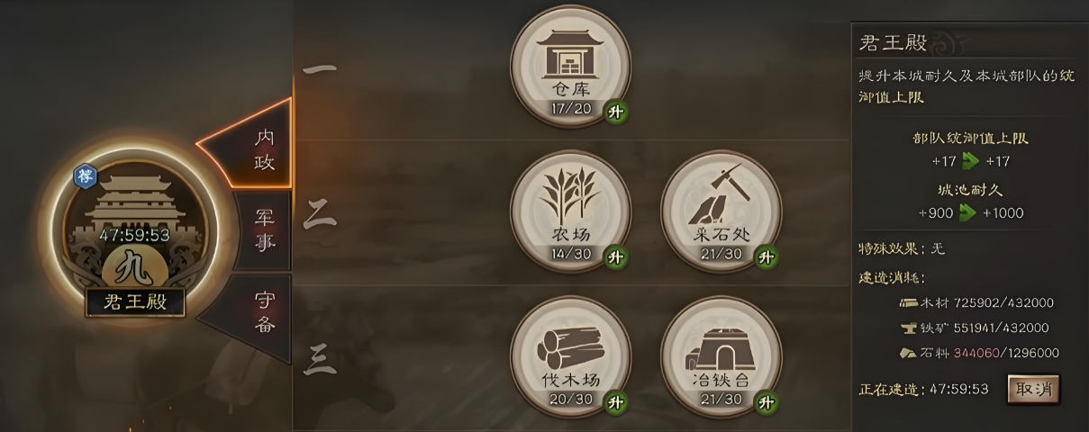 前期跟着主线任务走是最省心的选择,主线要求建什么就建什么,别乱点其他建筑。尤其是第四章到第六章阶段,城建时间会逐渐变长,这时候可以适当用铜币解锁建设队列加速进度。石料是升级君王殿最紧缺的资源,平时要多占石料地,屯田也优先选高级石料地。新手期48小时内记得利用体力减半和预备兵返还的福利多打地发育,这样能快速积累资源为七本冲刺做准备。