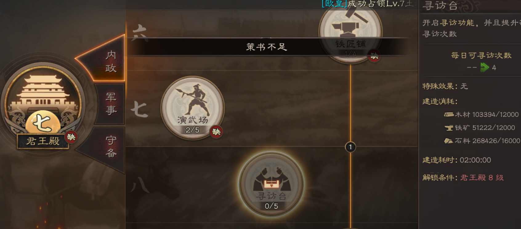 君王殿升到7级后,咱们的战斗力会迎来质变,因为能解锁兵营提升带兵上限。但在这之前可能会遇到资源卡点,这时候可以看看木牛流马事件,击败运输队能拿到额外资源。另外城建中的军舍、兵战系列建筑也别落下,它们能增加部队数量和属性,帮咱们更轻松地打高级地。如果发现资源差一点,不妨等等每小时自动恢复的策书,用屯田补足缺口。