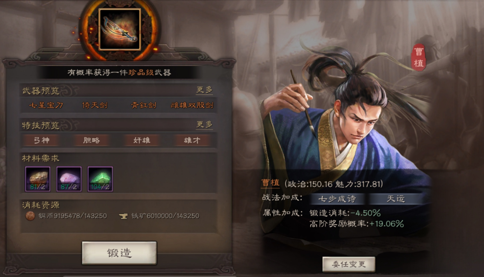 选择合适的锻造官非常关键,魅力属性高的武将更适合担任这个职位,因为他们能增加锻造出高阶装备的几率。政治属性则能减少材料消耗,虽然不如魅力重要,但在资源紧张时也很实用。咱们可以优先选择自带锻造加成的武将,比如曹植,他的技能能直接提升高阶装备产出概率。如果没有这类武将,高魅力角色如小乔、甄姬也是不错的选择。锻造官的加点建议全加魅力,最大化稀有装备的获取机会。