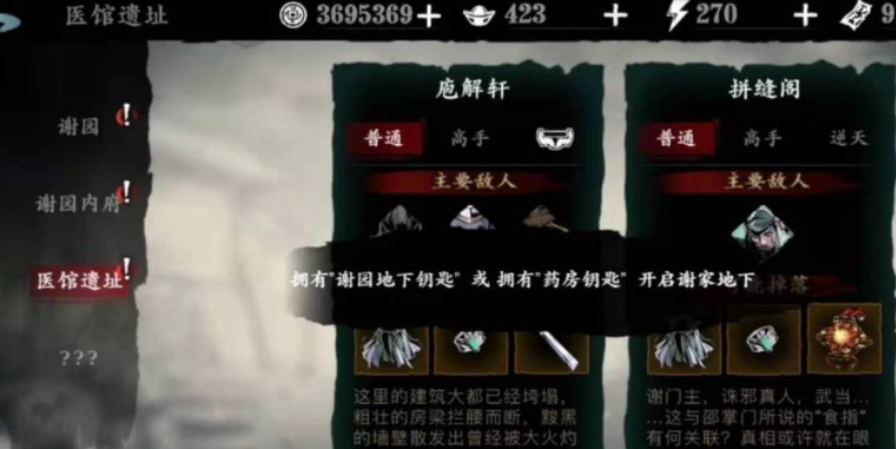解锁医馆遗址,咱们得先完成主线任务谢园之谜。这个任务是开启后续内容的关键,必须认真打完谢园关卡。通关后别急着退出,在跳转页面会看到谢园图标,点击它就能进入谢园内府任务。谢园内府不算难,但记得把支线清理干净,避免遗漏影响进度。