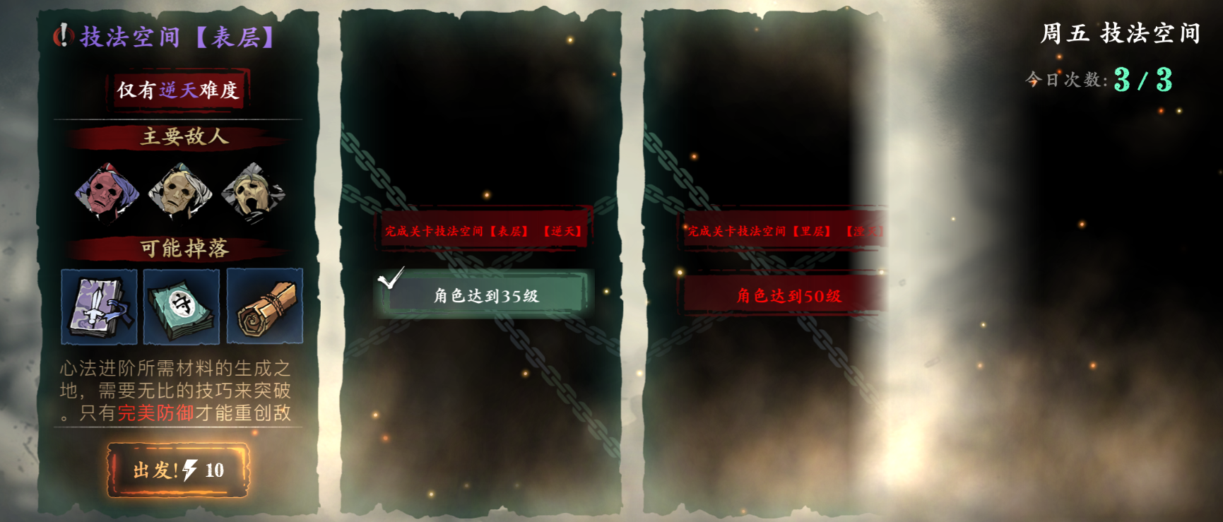 技法空间是咱们获取心法进阶材料的重要副本,入口位于昼夜空间内,图标是一个带问号的球形漩涡。周一到周五每天开放不同副本,周末则开放两个。这里的怪物防御极高,常规攻击无效,必须依靠弹反机制才能造成伤害。弹反成功可以秒杀小怪,但需要掌握好时机和距离。建议提前查看攻略熟悉敌人特性,合理搭配装备应对不同攻击类型的怪物。
