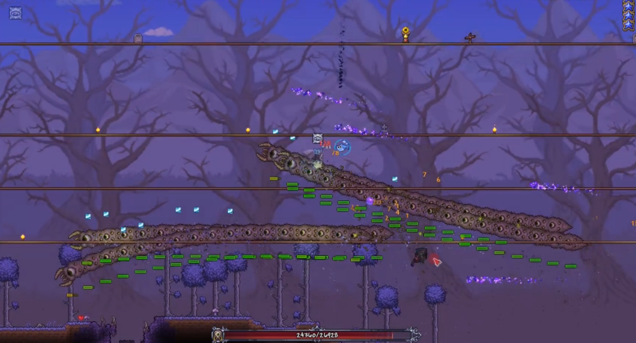 战术细节上,保持垂直移动比水平移动更有效,因为世界吞噬者的体节会尝试包围玩家。使用平台或绳子的高度差可限制其移动路径。分裂后的小型个体攻击模式不变但血量降低,应集中火力快速清理。若采用远程策略,小丑之箭或邪箭的穿透特性可同时命中10个以上体节。近战时推荐保持旋转攻击姿态的武器如暗夜战斧,或使用Arkhalis剑进行高频输出。