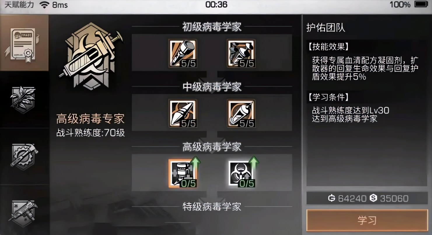 职业前期加点需注重资源采集效率,初级病毒学家的采样技能可跳过,因当前版本采集卷替代了其功能性。活化技术建议点满,制作血清时20%概率额外产出的特性可降低资源消耗。中级阶段的高效利用对辅助流更为重要,而战斗流则可侧重病毒药剂强化,该技能满级后病毒子弹数量翻倍,显著提升持续输出能力。
