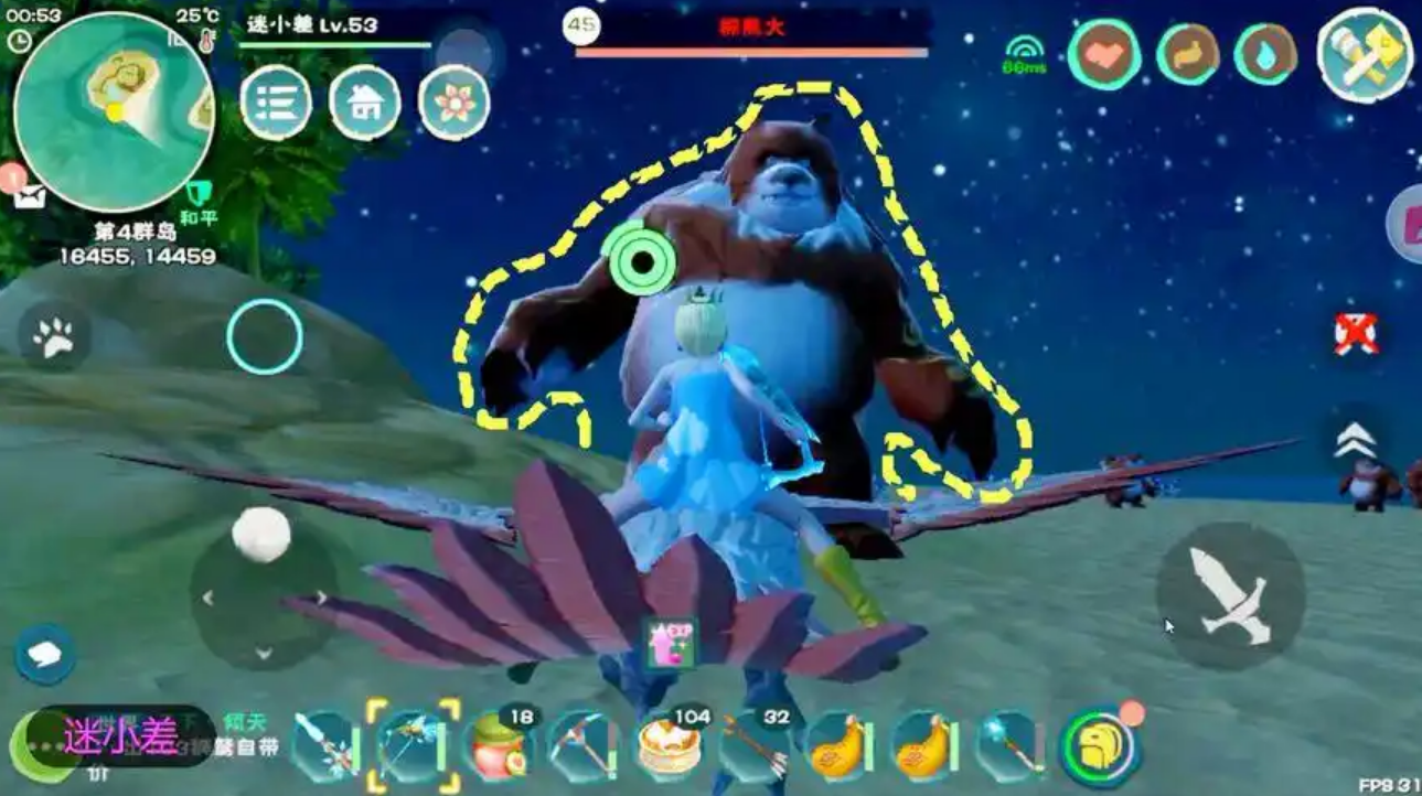 捕捉棕熊大前需确认自身等级达到45级,否则无法触发捕捉机制。棕熊大的刷新点包括拉鲁火山灯塔下方银矿点、秋湖左侧及蔚泷湖左侧等坐标区域。找到目标后,需先将其血量降至较低水平,再用木棒击晕,随后投喂饲料直至出现爱心标志,最后使用捕捉器完成驯服。棕熊大的资质为5.0-0.6-1.7,击杀后可掉落优质肉,实用性较高。