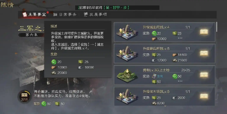 跟着主线任务走,每次完成建筑升级或打地任务都能拿到不少石头和铁。尤其是新手期,任务给的资源特别丰厚,千万别乱点跳过。有些专属任务还会额外奖励高额石头,比如铁壁营和尚武宫升级任务,记得优先完成这些!