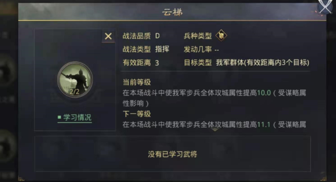 提升武将攻城值的核心在于兵种选择、战法搭配、属性成长与实战协同。步兵是攻城首选兵种,其基础攻城成长值普遍高于骑兵和弓兵,例如三星步兵武将20级时面板攻城值可达35-40点,而骑兵除高顺等特例外普遍偏低。攻城值直接影响部队对城池耐久的削减效率,1点攻城值对应1点耐久伤害,因此组建专门拆迁队需优先筛选高攻城成长武将。