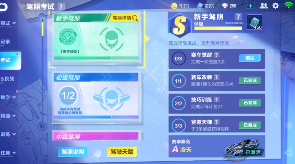 新手驾照是最基础的考试,主要帮助玩家熟悉游戏操作。考试内容包括竞速赛引导和道具赛引导,竞速赛会教授空喷、氮气加速等基础技巧,道具赛则介绍道具的使用方法。完成这两项引导任务后即可获得新手驾照。初级驾照需要玩家达到10级才能解锁,考试项目包括龙卷风攻击、漂移喷射以及老街管道限时赛,其中漂移喷射要求玩家熟练掌握漂移集气技巧。