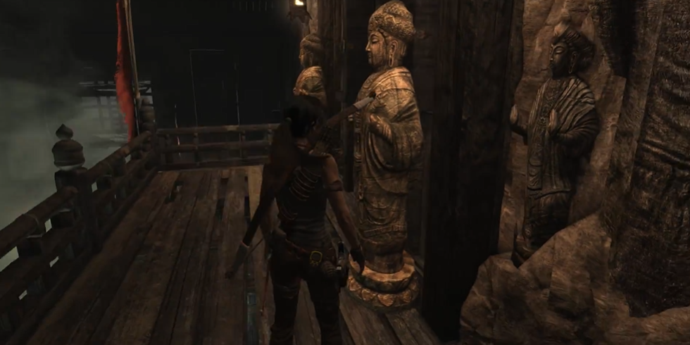 寺庙内部的隐藏要素与主线解谜紧密相关。第二层平台的火盆可用于重新点燃熄灭的火炬,而水闸附近的两根木棒需用火炬烧毁以触发货物堆积。燃烧的货物会引燃油桶制造爆炸通路,此环节需快速通过水帘间隙避免火炬再次熄灭。探索时建议优先激活求生本能技能,高亮显示可互动物体能显著降低遗漏关键道具的概率。