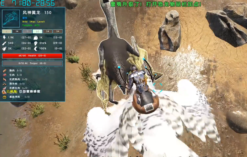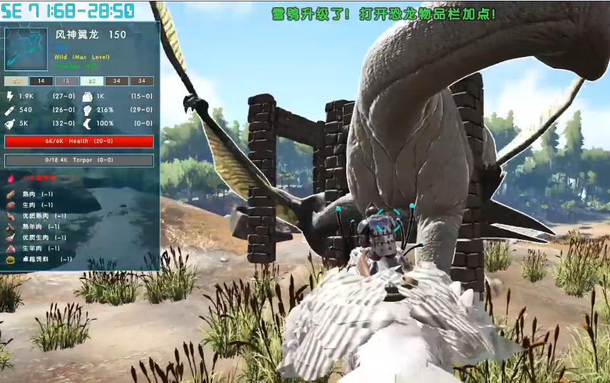 风神快晕时一定要盯紧落点!如果掉进水里或者食肉龙堆里,基本就白忙活了。建议提前在背包放些木质拒马,晕了立刻围起来保护。驯服时眩晕值掉得飞快,得多喂黑色浆果或麻醉药维持。最后提醒你,第一只风神最好选低等级的,五级那种就很好搞定,等有了基础款再抓高级的会更轻松哦。