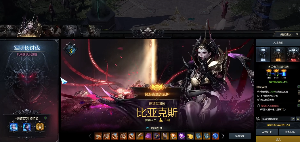开启欲望军团长副本需要满足特定条件。玩家的道具等级需达到1430或1460门槛,这是参与挑战的基础要求。必须完成贝隆南部的所有世界任务,随后返回主城接取名为指引公告:军团长副本的任务,只有完成该任务才能解锁副本入口。需该副本采用不可复活机制,一旦角色阵亡将无法继续战斗,因此对团队配合和操作精度有较高要求。