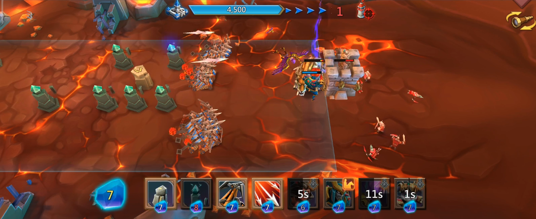 核心在于应对敌方高攻击英雄单位与防御塔的混合阵容。开局需优先在后场布置魔像塔作为承伤核心,随后在魔像塔后方部署炮车进行火力支援。敌方进攻波次以英雄单位为主,需利用图腾英雄的200%对英雄伤害加成快速清理关键目标,同时搭配火球或黑炎技能清场小兵。注意控制步兵单位数量,避免冲锋过猛被敌方炮台集中收割,需通过炮车和魔像的配合逐步推进。