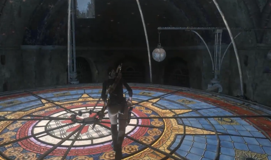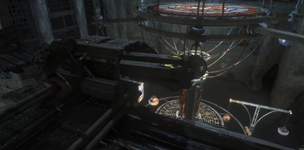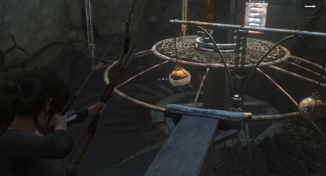在左上平台推动轨道装置解锁第一道锁,随后摆荡至另一侧平台重复相同操作解锁第二道锁。全部解锁后太阳系仪开始旋转,需用钩索荡至中央平台。需利用旋转机构完成动态跳跃:从竖板跳至横杆,待下方横梁旋转至脚下时松手落至其上,再跳至两端带竖板的机构,最终攀至中央柱子顶部。过程中需注意劳拉提示就是现在的时机,此为跳跃松手的准确节点。