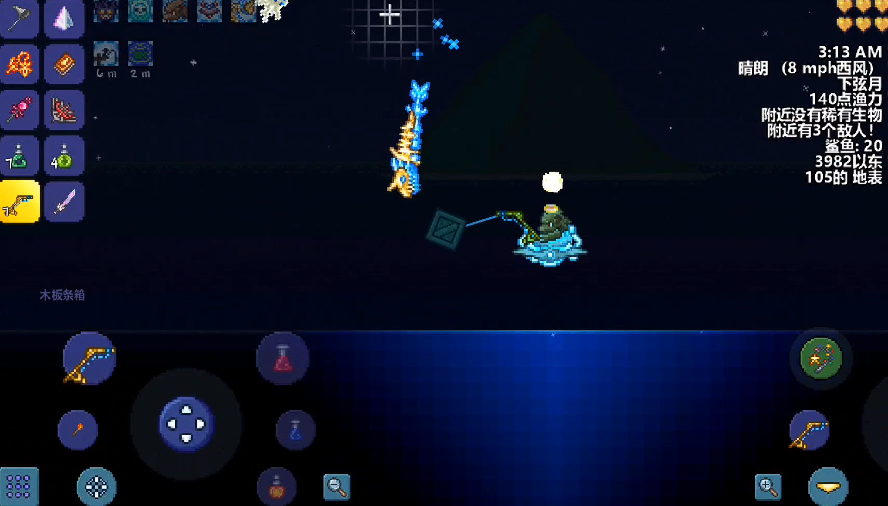 提升渔力的辅助手段包括穿戴渔夫套装(每件+5渔力)、使用钓鱼药水和猛力药剂。渔夫任务奖励的渔夫耳环和钓鱼背包可进一步增加渔力。避免角色浸入水中(需使用水上漂靴或史莱姆坐骑),并清理背包以确保钓获物品有足够空间。若需批量钓取,可通过替换鱼竿与武器挥动动画的技巧实现多线钓鱼,但会加速鱼饵消耗。