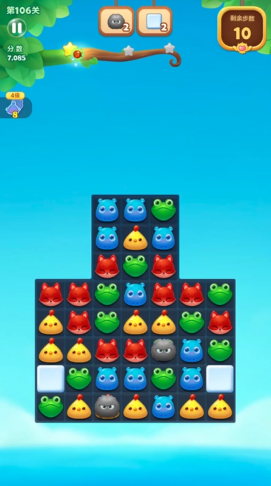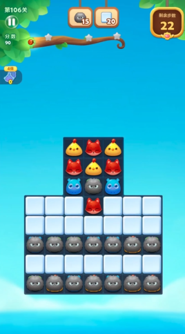 通过开心消消乐的第106关,首先得搞清楚这一关到底要我们做什么。这一关的核心目标是在32步之内消除掉总共64个冰块,别看步数好像不少,但冰块的数量也多,而且场景里摆满了各种障碍,一步都不能随便浪费。这一关的场地设计有点特别,中间不是完全连通的,有一些镂空的地方,而且还有讨厌的树藤缠绕着动物,最关键的是出现了褐色毛球这个新家伙。它不能直接消除,还会动来动去挡住别的动物,有时候正好就卡在你想要合成特效的那个位置,特别耽误事。所以开局之前一定要多看几眼,心里大概有个谱,知道冰块都分布在哪些角落,哪些障碍物是需要优先处理掉的。这一关只要拿到九万分就能通关,但要想拿到三星评价,就得冲击十四万分,所以光完成任务还不够,还得想办法多挣点分数才行哦。