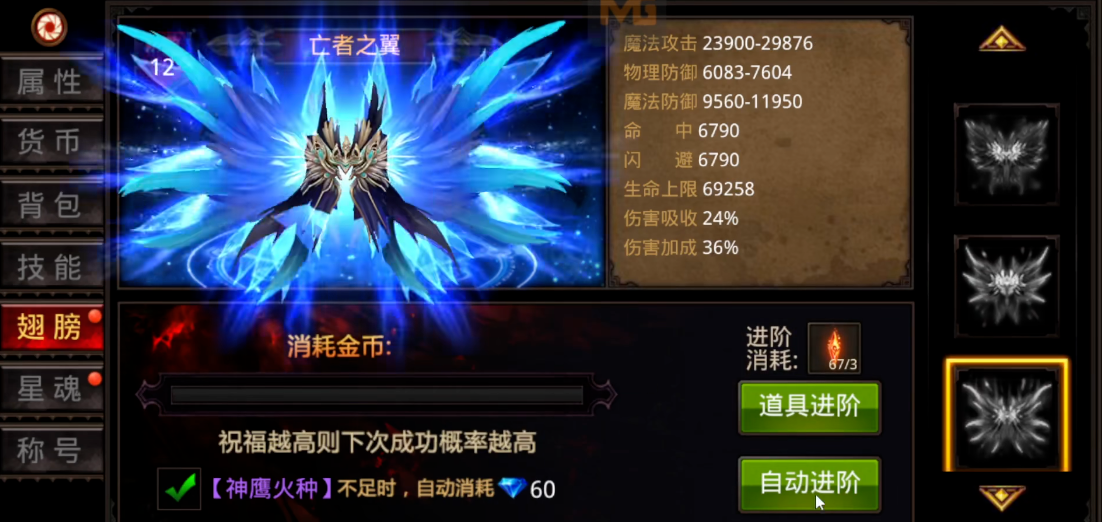 翅膀星数满十星后玩家可以点击进阶按钮进入操作界面,进阶必须消耗神鹰火种和一定数量的游戏金币。每次使用神鹰火种进阶都会积累祝福值,祝福值越高下一次进阶的成功概率就越大,进阶成功后翅膀的阶数会提升,外观和属性都会发生显著变化。持续进行进阶是让翅膀品质向加十三迈进的关键步骤,过程中需要合理规划材料使用。