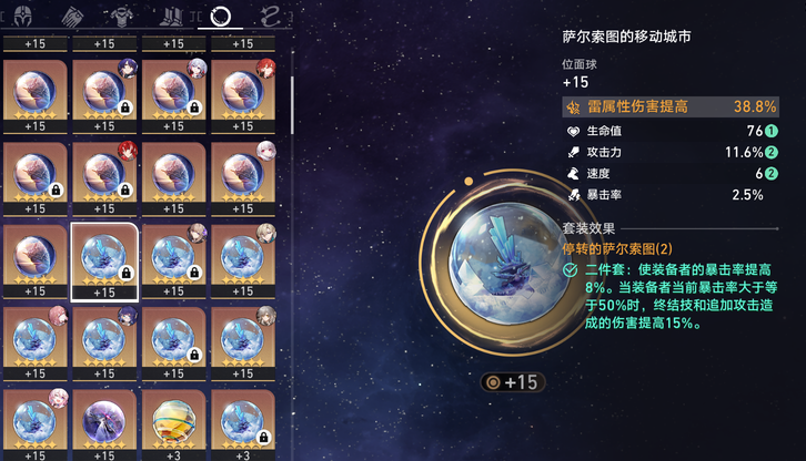 也就是连接绳和位面球这两个位置的套装。这里首选的搭配是停转的萨尔索图两件套。这个套装的效果是直接提升百分之八的暴击率,并且当装备者的暴击率达到百分之五十或以上时,其施放终结技和追加攻击造成的伤害会额外提高百分之十五。这个效果可以说为黑塔量身定做,因为她本身就是一个靠追加攻击和终结技打伤害的角色,而且触发条件对于后期成型的面板来说并不难达到。另一个可以考虑的选项是太空封印站,它的两件套效果是提升百分之十二的攻击力,并且在速度大于等于120时还能再提升百分之十二的攻击力,如果队伍能保证黑塔的速度,这个套装也能提供非常可观的攻击力加成。