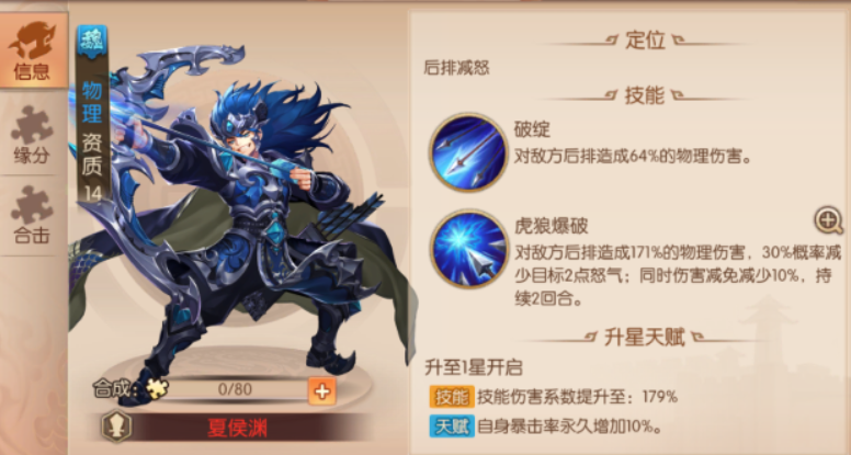兵符的选择直接影响夏侯渊的输出效率,建议携带狂熊符来增强爆发伤害,或者搭配凤鸣符提升团队增益效果。需要注意的是兵符技能即使武将阵亡也能触发,合理利用这一点能在残局阶段扭转形势。阵容搭配方面,夏侯渊适合与减怒和增益型武将组合,魏国阵容中的夏侯惇与夏侯渊可解锁合击技能拔矢怒斩,造成高额伤害并附加眩晕,进一步提升队伍的整体战斗力。张辽、许褚等武将能补充群体伤害并施加减怒效果,有效降低敌方技能释放频率。将夏侯渊放置在后排安全位置,前排配置一些稳固的坦克型角色,能有效保护他的输出环境。