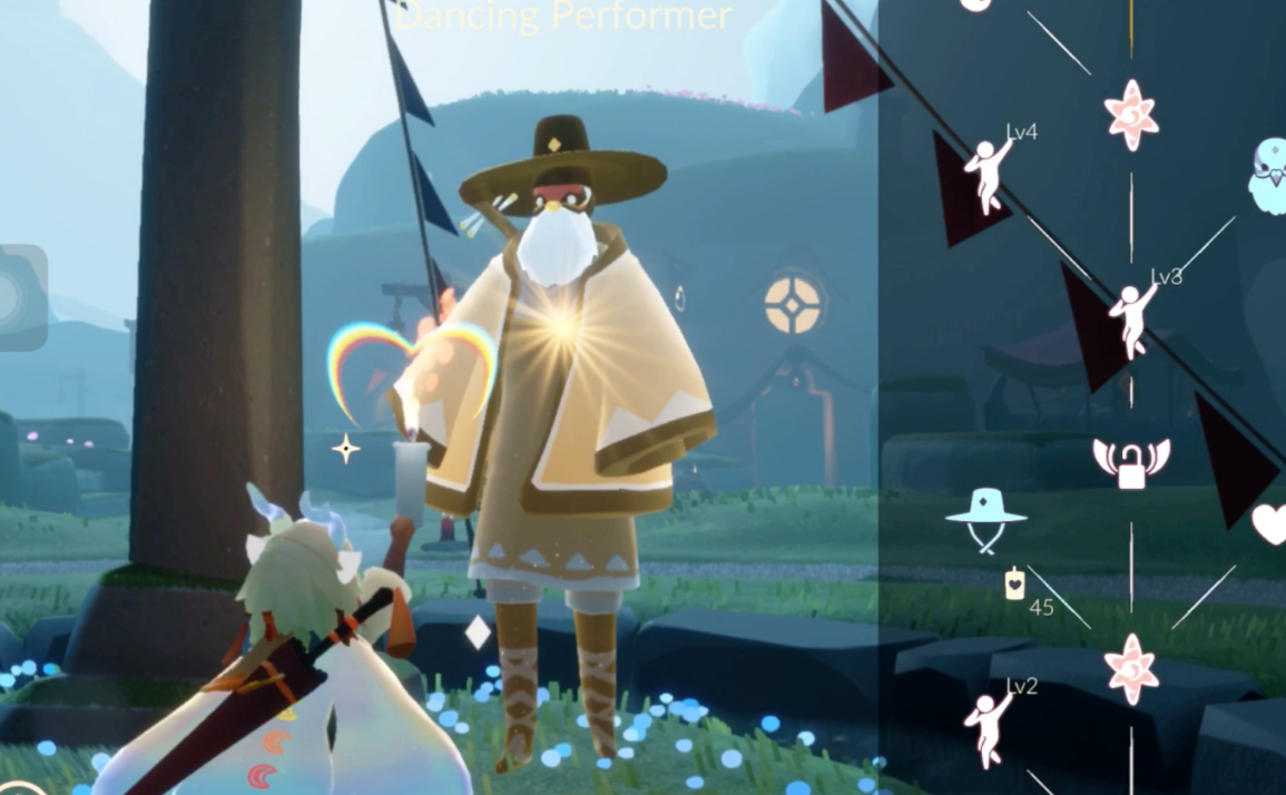 跳舞艺人先祖提供一系列限定物品和动作供玩家兑换,这些资源需要提前收集游戏内的货币,包括白蜡烛、季节蜡烛、爱心和暴风蜡烛,常见兑换内容包括黑色汉代斗笠、长鼻老人面具、琵琶乐器、爱心道具以及跳舞动作本身,总计通常需要约226至250根白蜡烛、13颗爱心和2根暴风蜡烛才能完成所有节点的解锁。