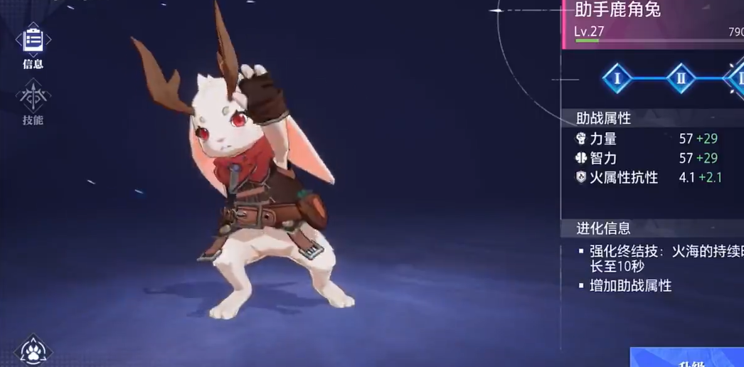 关于鹿角兔的技能进阶,这也是培养它时需要重点了解的部分。这个萝卜砰砰弹技能是会进化发生变化的。当鹿角兔进化到二阶时,扔出的萝卜炸弹爆炸后,就不会只是炸一下就完事,而是会生成一片持续燃烧5秒钟的火海,这片火海能够灼烧所有被炸到的敌人,这就让它从一次性爆发伤害,多了些持续伤害的能力。如果继续培养到三阶,这片火海的持续时间会进一步延长到10秒,持续作战和清场的效果就更明显了,虽然单次爆炸的伤害数值没变,但整体的输出总量会因为火海而得到不错的提升。