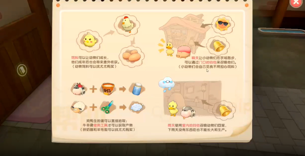 如果发现鸡棚空间不足,你可以直接进入鸡棚内部,点击右下角的动物仓库,再选择左下角的扩建按键,鸡棚就会扩大一倍容量,无需再专门前往阳光农场处理。如果鸡在户外活动时你需要召回它们,只要进入鸡棚点击内部悬挂的铃铛,家禽就会陆续回到棚内,方便你集中喂养或收集产物。
