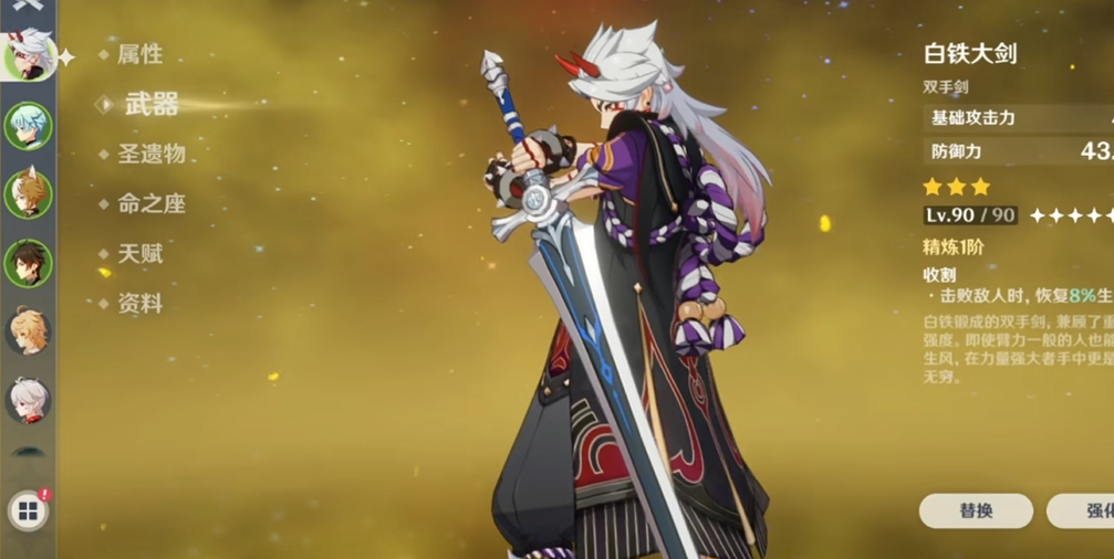 游戏中直接提供防御力加成的大剑数量不算多。其中一把是三星武器白铁大剑,它的副属性就是提升防御力百分比,满级后能提供不错的防御加成。这把武器通常可以通过开启游戏世界里的宝箱获得,属于前期比较容易入手的装备。它的武器特效是击败敌人后回复生命值,这个效果在前期探索和大世界战斗中能提供一定的续航能力,对于新手过渡来说是比较实用的选择。