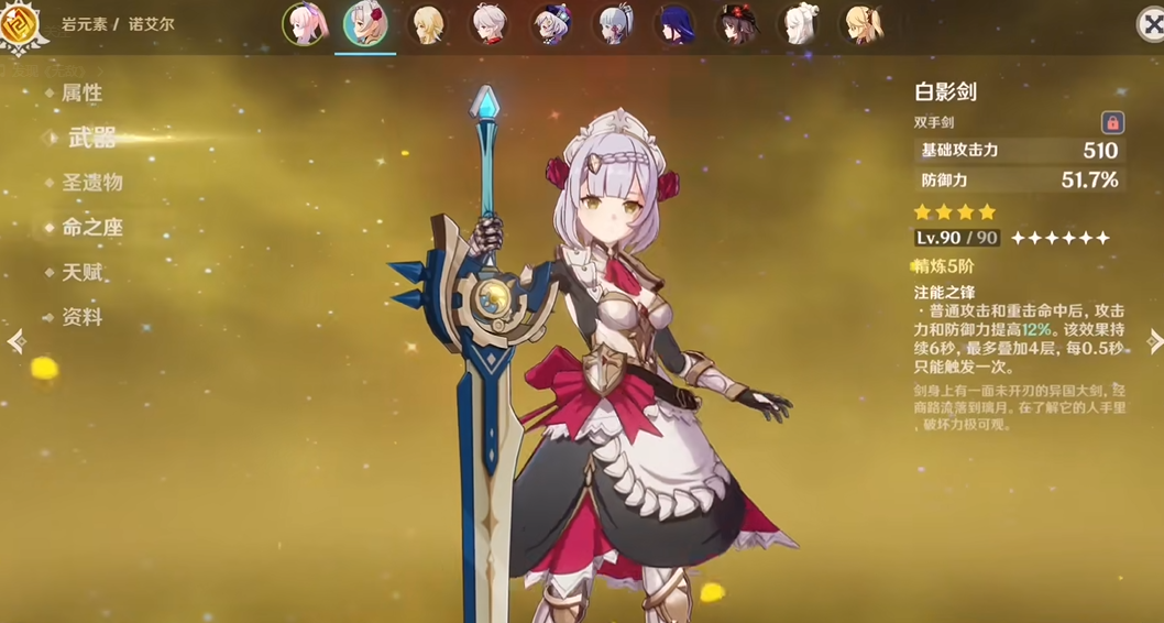 除了三星武器,四星锻造武器白影剑也是一把以防御力为核心属性的双手剑。它的副属性同样是百分比防御力提升,并且数值上高于三星的白铁大剑。它的武器特效是在普通攻击和重击命中后,能提升攻击力和防御力,最多可以叠加四层。这个机制对于需要站场输出的防御力角色来说比较契合,能同时兼顾生存与输出能力。白影剑的锻造图纸可以在蒙德城的铁匠处兑换,只要收集齐对应的材料,玩家就可以自己打造并精炼,是获取途径相对稳定的一把防御向武器。