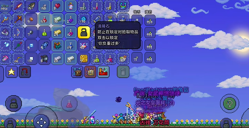 阻挡石在游戏里的正式名字叫负重石,这个东西用起来其实挺简单的,就是放在你的物品栏或者快捷栏里,直接使用它就行。一旦你用了它,身上就会有一个临时的效果,在这个效果持续的时间里,地上所有的物品你都没法捡起来,连那些可以堆叠的东西和能进虚空袋的也不行。这听起来好像是个负面效果对吧,但对清理场地或者专注于做某件事的时候特别管用。比如你吭哧吭哧在挖一个很深的地狱直通车,挖下来的土块石头会掉得到处都是,这时候用上负重石,就不用担心背包一下子就被这些杂物塞满了,可以让你更专心地往下挖。