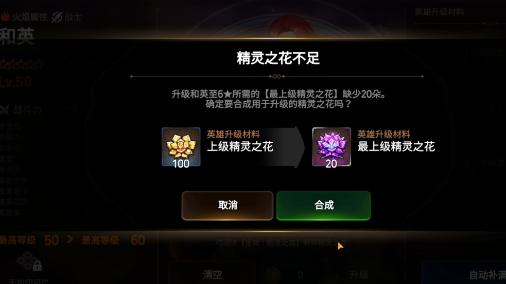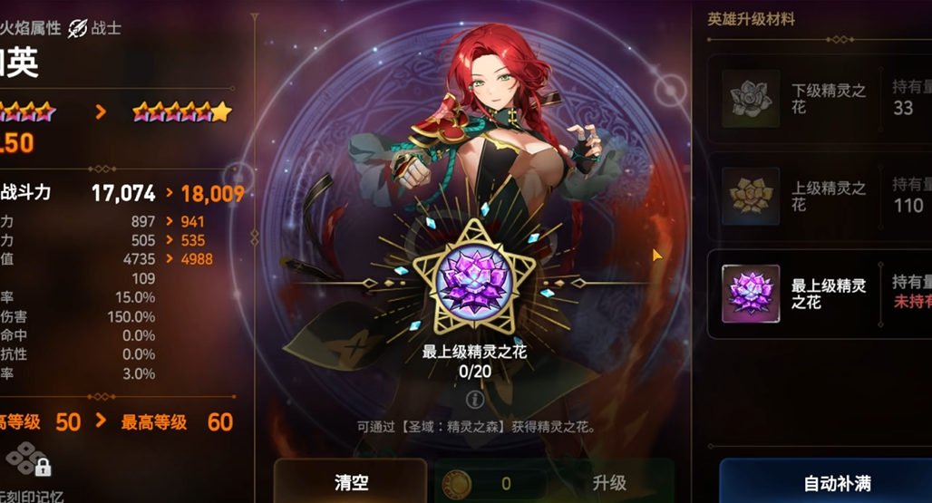 合成最上级精灵之花主要通过游戏内的角色升星界面完成,首先玩家需要进入游戏主页面并选择一位五星英雄,然后点击该英雄下方的升级按钮,在打开的界面中选择自动补满选项,最后点击合成即可将低阶材料转化为最上级精灵之花。这个过程是游戏设计的一部分,专门用于帮助玩家在培养高星级角色时快速获取必需的高级突破材料,避免了繁琐的手动操作,让资源管理更加便捷高效。