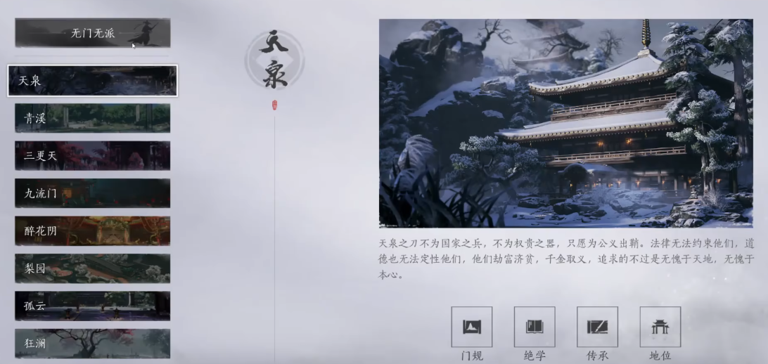 选择操作相对直观、容错率较高的门派往往会获得更平顺的体验。天泉门派因技能机制简单明了,同时兼具防御和输出能力,被广泛推荐给新手。青溪作为治疗辅助,在团队中需求稳定,且其技能循环也较为易于掌握。游戏在前期并不会强制玩家绑定某个门派,你完全可以以一种无门无派的散人身份开始探索,在熟悉了世界和战斗系统后,再根据吸引你的武学或文化来决定加入哪个组织。