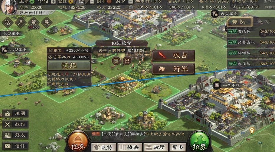 进攻部队的配置直接关系到战损高低与行动成败。主力队伍必须具备稳定的输出和续航能力,推荐选择高星级且兵种适性高的武将,其携带的战法等级不应低于8级,核心武将最好完成觉醒。兵力方面,攻打6级地至少需要1.2万兵力,而挑战7级或更高级土地时,队伍总兵力需提升至1.5万乃至2.8万以上。除了主力队,还必须准备两支兵力在2万左右的副队作为战术兜底,用于在主队打平后进行补刀或在战况不利时紧急救援。