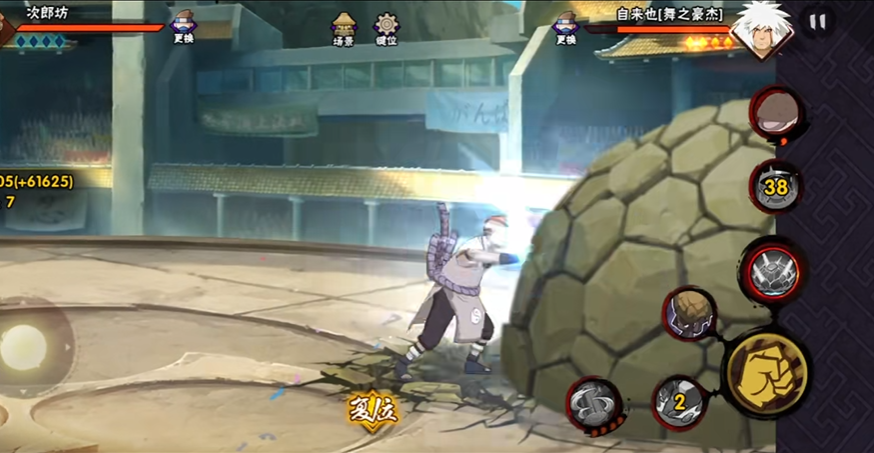 次郎坊属于力量型忍者拥有强力的抓取和高伤害技能但动作整体不算太快,攻击前摇比较明显,这是对战他的主要突破口。他的一技能土陆归来能拍出石板突击,命中后可以抓取敌人砸地,是一个有效的起手手段。二技能土陵团子是举起巨石砸向对手,虽然可以调整投掷角度但移动速度慢,容易被有准备的走位躲开。他的普通攻击连贯性很好,特别是第三段可以击飞敌人,第四段和第五段都带有抓取效果,一旦被其近身普攻连上会相当棘手。他的奥义范围大,但在释放前有明显的抬手动作,这为玩家提供了躲避的信号。他通过奥义可以进入咒印形态变身,这通常会刷新其技能并改变技能形态,拥有更强的压制力,是战斗中的一个重要转折点。