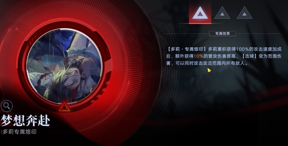 多莉是一名危级(S级)禁闭者,职业为狂暴,擅长物理输出。她的核心技能机制围绕着攻击速度的叠加与转化展开。其普通攻击击球为多段物理伤害,必杀技暴走能让她进入狂暴状态,大幅提升攻速与普攻伤害。关键被动击球练习使得她在累积足够攻速后,普攻将转变为范围伤害,而失控预兆则能在战斗中随时间自动叠加提升攻速的狂躁印记。这套技能组设计使其在持续作战中具备越战越强的潜力,但爆发输出依赖于必杀技的启动周期。