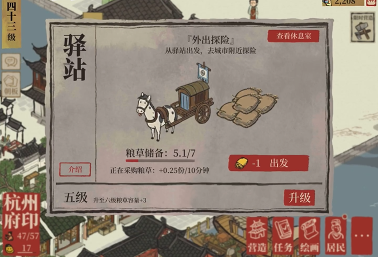你需要在城市地图上找到标记为驿站的废墟,点击其上的修复探索选项,即可开始建造。修复完成后,驿站建筑便会出现在你的城市中,它不仅是客商云集之地,更是你派遣居民外出冒险、获取珍贵资源的核心场所。驿站本质上是一个专属于你的探险副本。建造完成后,点击驿站图标进入,便可以看到派遣界面。每次探险需要组建一支小队,由一位特殊居民带领两位普通居民共同进行。这里需特殊居民是探险的主力,他们拥有体力这一属性,其体力值的大小直接取决于该居民的冒险属性,公式大致为冒险属性除以2等于体力值。