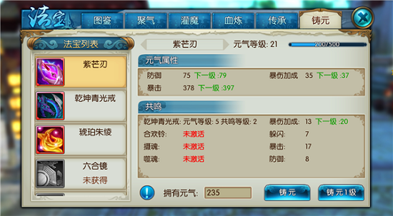 了解完元气怎么买和怎么刷,还得知道它到底用在哪儿、怎么用才划算。元气是专门用于法宝铸元系统的消耗品。只有那些你曾经激活并收集过的法宝,才能进行铸元操作。使用元气培养法宝后,该法宝的元气等级就会提高,从而永久性地提升角色对应的元气属性,比如攻击、气血、暴击等等,而且这个属性加成是永久的,即使后来这个法宝不在你背包里了,加成依然生效。每个法宝的铸元等级上限是200级,消耗的元气量可不小,所以有规划地使用很重要。