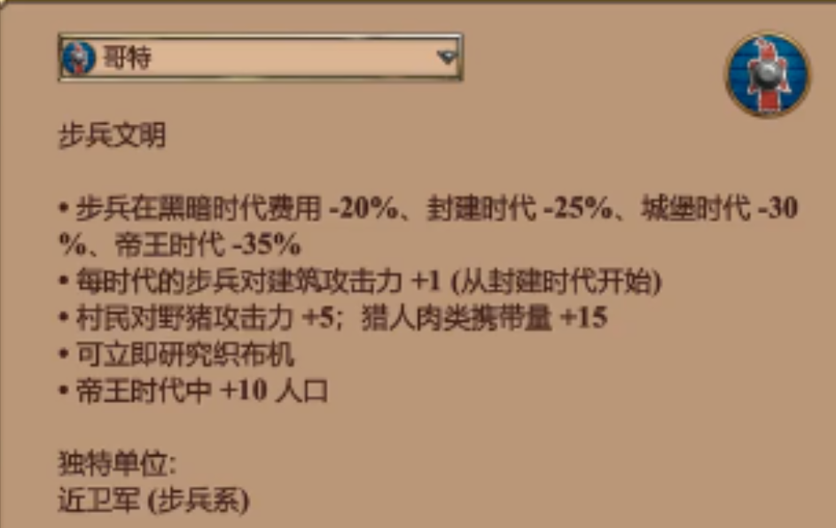 哥特文明则依靠纯粹的步兵海战术在后期立足。他们的步兵生产成本显著降低,且兵营训练速度极快,配合相关科技能在帝王时代瞬间爆出数量庞大的步兵军团。尽管单个步兵质量一般,但源源不断的人海攻势足以淹没大多数高级兵种,在消耗战中表现突出。
