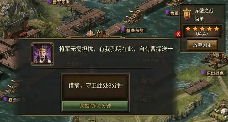 推荐使用马超、许褚、典韦和魏延等高输出武将,兵器需达到95级以保障基础战力。水域将(如甘宁)适合防守河中西侧,平原将(如马超)适合快速突进。防御类装备会延长战斗时间,建议优先携带攻击型装备。战神难度中,草船借箭成功后需立即调派最强武将驻守曹军壁垒,后续推进可大幅降低敌方兵力。占领15座城池可额外奖励1分钟,但需平衡事件处理与攻城节奏。