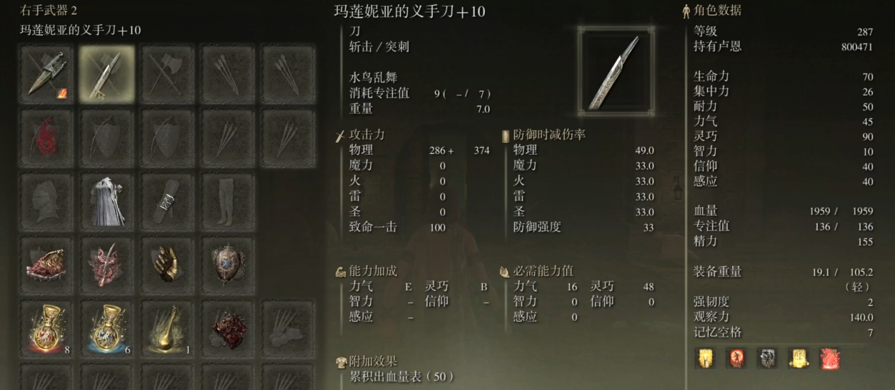 从实用角度看,水鸟刀更适合中后期构建成型的玩家。其战技虽强力,但消耗专注值较高,建议搭配增加专注值的护符或灵药。武器的基础攻击距离较短,对抗某些BOSS时需谨慎选择输出窗口。若以水鸟刀为核心配装,可考虑搭配增加连击伤害的护符(如米莉森的义手)或提升灵巧的护符(如腐败翼剑徽章),以最大化其爆发潜力。