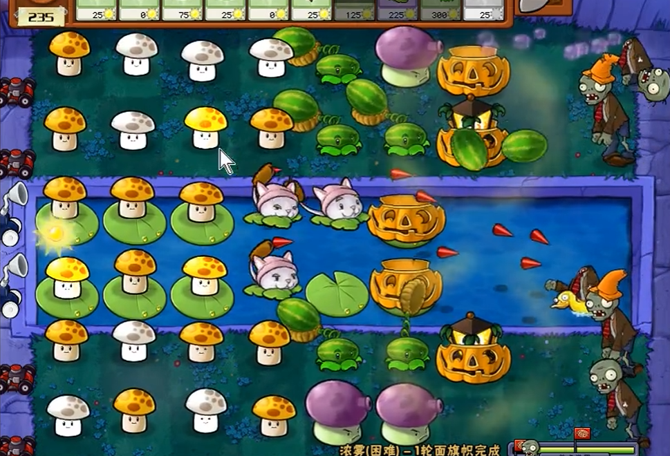 中后期需重点防范巨人僵尸和冰车僵尸的推进。保留至少两个樱桃炸弹或窝瓜作为应急手段,并在泳池区域维持两排冰西瓜提供群体减速。每轮结束后回收阳光时优先补充被破坏的南瓜头和高坚果,同时逐步替换小喷菇为忧郁菇或机枪射手提升输出效率。投石车僵尸出现时需提前在对应行放置莴苣保护后排植物。