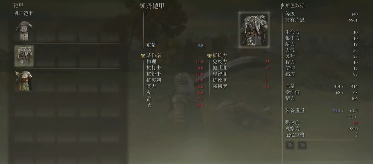 合理的防具选择能显著提升生存能力。凯登佣兵套以其高物理防御和均衡的属性抗性成为近战职业的首选,尤其适合力量型角色在雪山或高难度区域作战。芦苇之国套则侧重敏捷加成,轻量化的设计便于快速翻滚,适合需要灵活走位的玩家。大树守卫套作为稀有掉落装备,拥有独特的黄金树抗性加成,适合对抗特定属性的敌人。