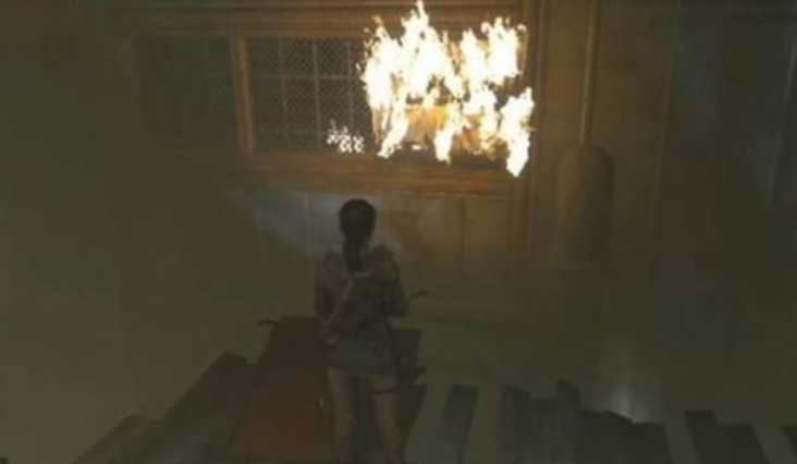 完成矿车固定后,需返回中间平台点燃第二个燃烧瓶,目标是对面被白布遮挡的入口。由于矿车已阻挡大部分水流,燃烧瓶可正常穿过剩余水幕引燃障碍物。若火焰仍被浇灭,可能是矿车位置偏移,需检查绳索是否绷紧。烧毁障碍物后进入内部房间,爬上二楼拉动机关,矿车会彻底封堵水流通道,中央区域水位下降,露出通往古墓深处的路径。