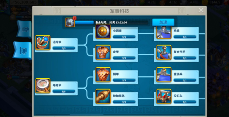 科技研究需侧重军事领域,农业科技可通过探索村庄免费获取,因此无需消耗资源。军事科技优先完成T2兵种研究,预留加速道具以便后续快速解锁T3兵种。VIP等级提升至7级是关键,可通过宝石投资实现,驿站将解锁8小时加速购买权限。压堡期间需持续训练部队,优先生产一级攻城车用于资源采集,其他兵种保持均衡增长以提升整体战力。