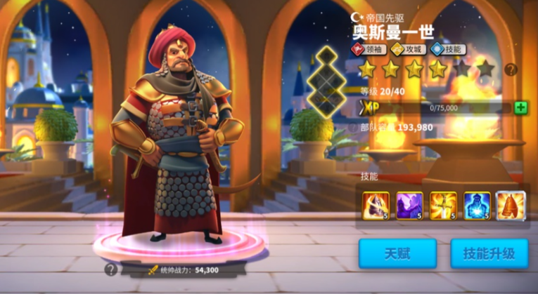 奥斯曼一世作为史诗级统帅,天赋配置包含领袖、攻城和技能三条路线。野战推荐采用纯技能天赋加点,最大化雷霆之势和征服者的主动技能伤害加成,配合副将佩拉约或腓特烈一世可形成混编优势。攻城场景则需切換至攻城天赋树,搭配西庇阿等副将提升破墙效率。该统帅通过酒馆宝箱或文明活动获取,技能升级优先顺序为1技能>3技能>4技能,觉醒后苏丹之怒可额外降低目标防御力。
