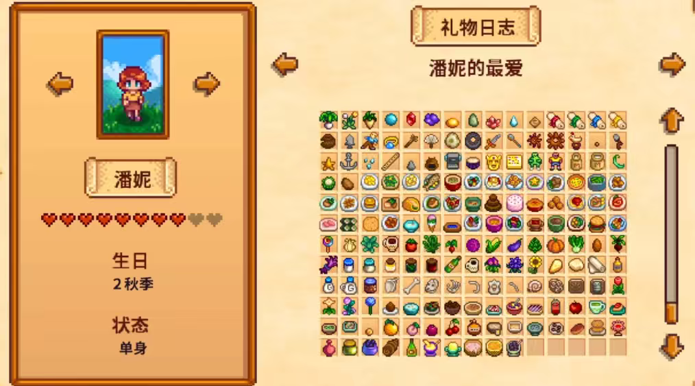 钻石、绿宝石、虞美人等是潘妮最爱的礼物,而水产类、矿石类物品容易引起反感。生日当天赠送黄金南瓜或魔法糖冰棍等最爱礼物,可获得8倍好感加成。日常对话中避免提及工作话题,多讨论阅读和教育相关主题更符合她的兴趣。