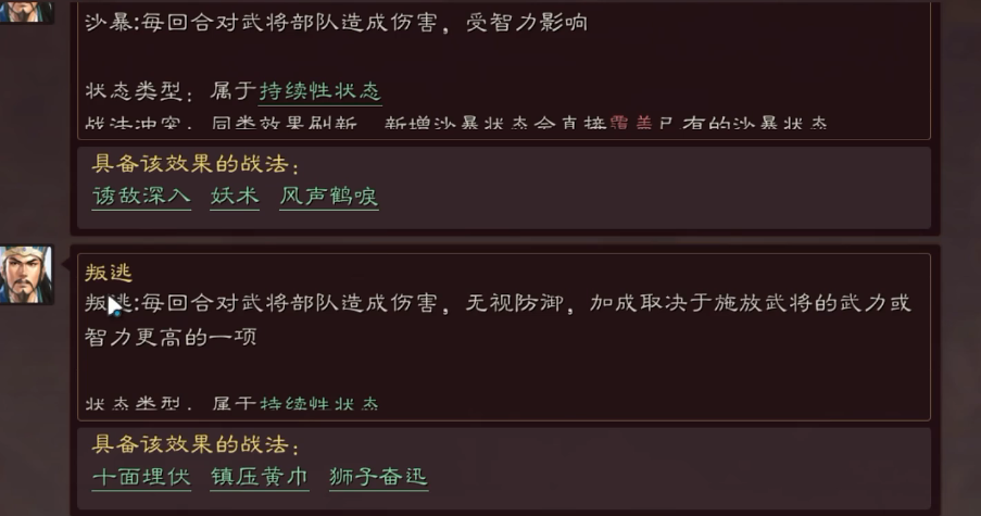 溃逃状态主要承担持续压制的战略功能。其每回合固定触发的伤害特性,能有效弥补主动战法发动率不稳定的缺陷,尤其适合搭配高武力武将组成稳定的输出体系。需溃逃状态虽然能穿透防御,但无法享受会心、奇谋等暴击加成的增幅,这使得它在对抗高统率部队时更具优势,而在面对谋略型阵容时效果相对有限。