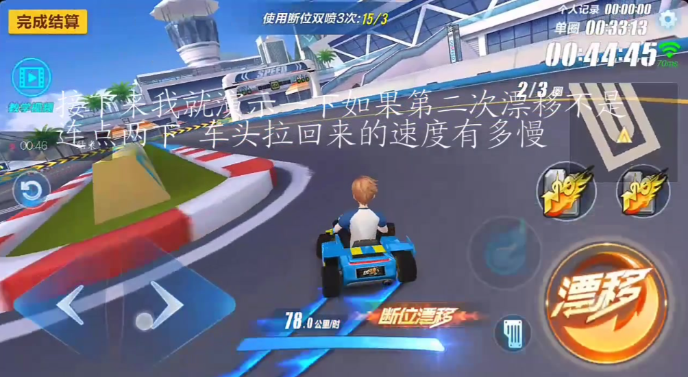 进阶应用中,断位双喷是更高效的技术组合。完成断位漂移后立即衔接两次小喷,既能保持车速又可快速集满氮气。直道上使用时需先调整车头与赛道形成轻微角度,漂移后通过反方向键与双次漂移键实现断位,最后用两次小喷提速。