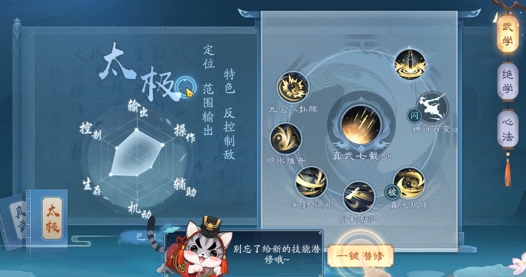 武当门派在新笑傲江湖手游中以剑气系统为核心,战斗风格兼具控制与爆发。其技能分为真武与太极两大流派,真武侧重远程爆发与战术牵制,太极则擅长持续输出与防御反击。剑气是武当的核心机制,部分技能可积攒剑气,最多储存5点,消耗剑气可释放奇招造成高额伤害。职业技能会根据当前剑气数量变化,剑气不足5点时释放小范围AOE,满5点时释放大范围高伤害技能,合理管理剑气是制胜关键。