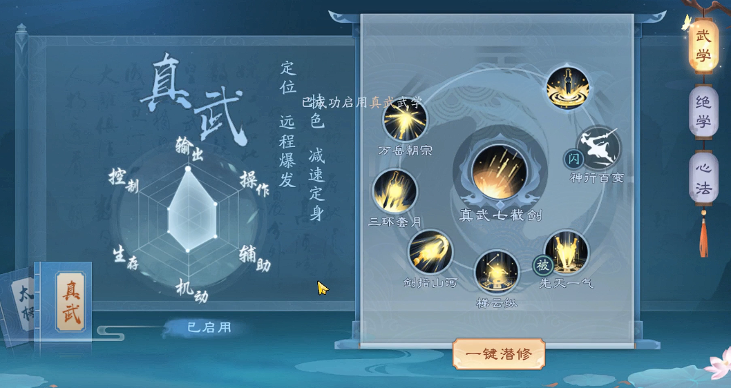 真武流派的技能组合以机动性和单体爆发见长。梯云纵是核心位移技能,可瞬间冲锋8米并减速周围敌人,衔接剑指山河能对减速目标追加10%伤害。万岳朝宗提供两段伤害与浮空控制,三环套月则依赖残影距离提升输出,远距离释放伤害更高。神门十三剑作为消耗全部剑气的终结技,配合被动天地不仁可叠加至多20%伤害增幅,需在BUFF满层时释放以最大化收益。