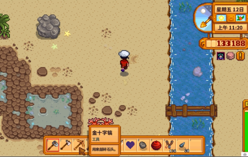 到达西部后首先会看到农场区域,这里不仅是第二生产基地,还藏着不少金核桃。农场右侧的山洞里有只爱吃农作物的青蛙,种好它要求的甜瓜、小麦和大蒜后不要收割,直接对话就能获得奖励。沙滩边的沉船内部有隐藏宝箱,而潮汐池附近的海星围成特殊图案时,记得用锄头挖掘中央位置。西部的史莱姆小岛也是个重点区域,击败特殊史莱姆有概率掉落金核桃,每天都会刷新。